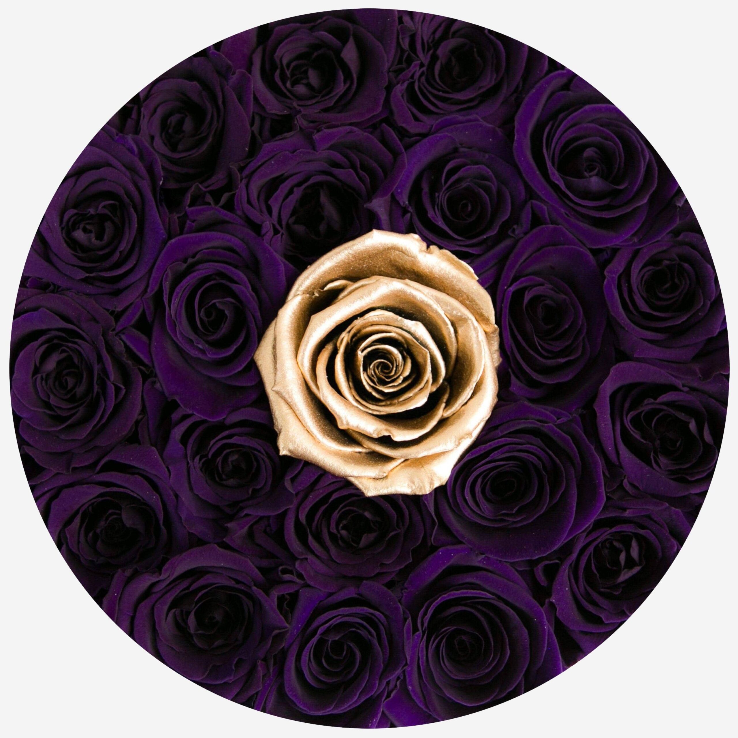 Our Classic collection embodies this stylish simplicity in a black box filled with dark purple and gold long-lasting roses.